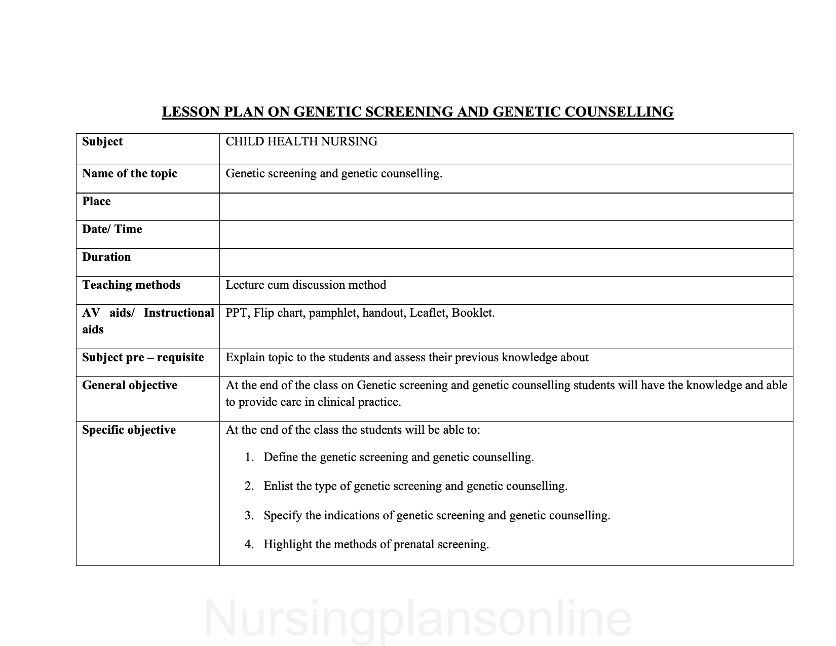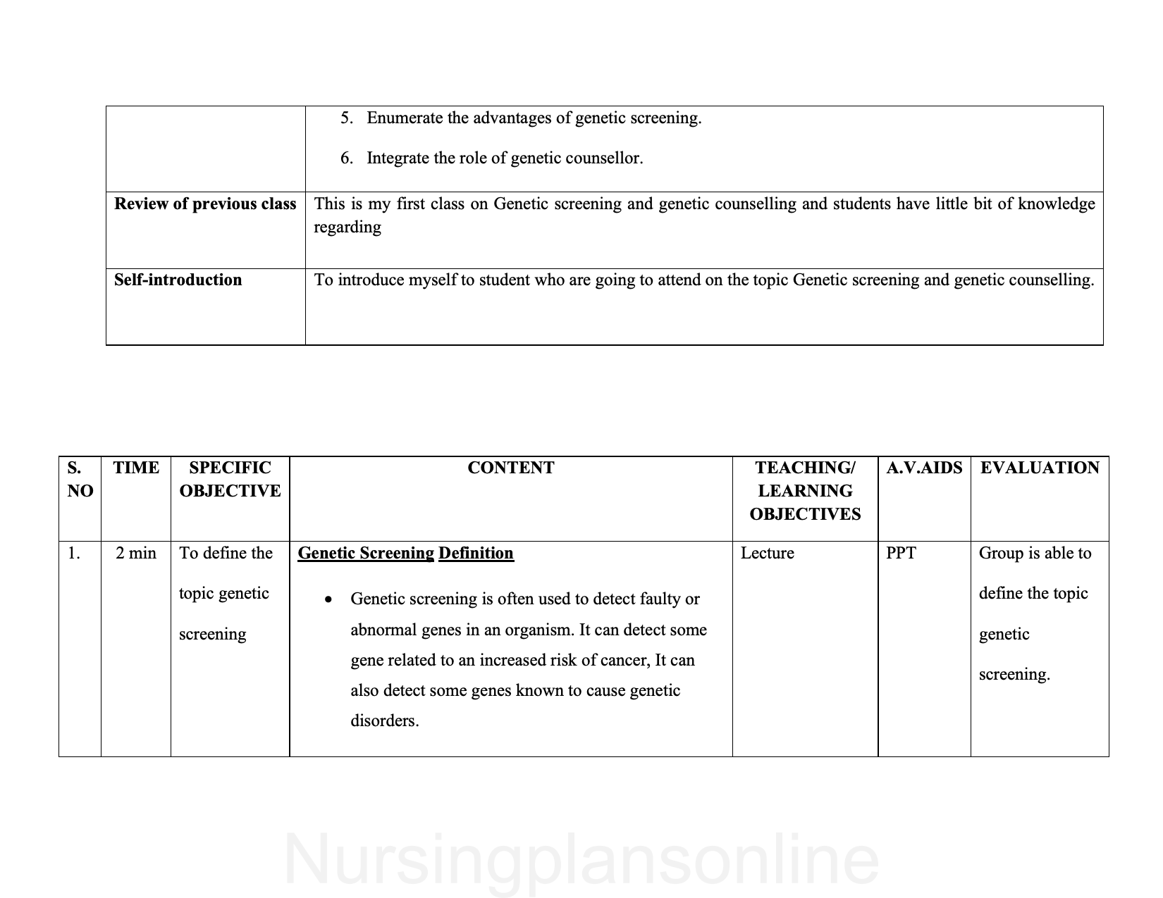 LESSON PLAN- GENETIC SCREENING AND GENETIC COUNSELING