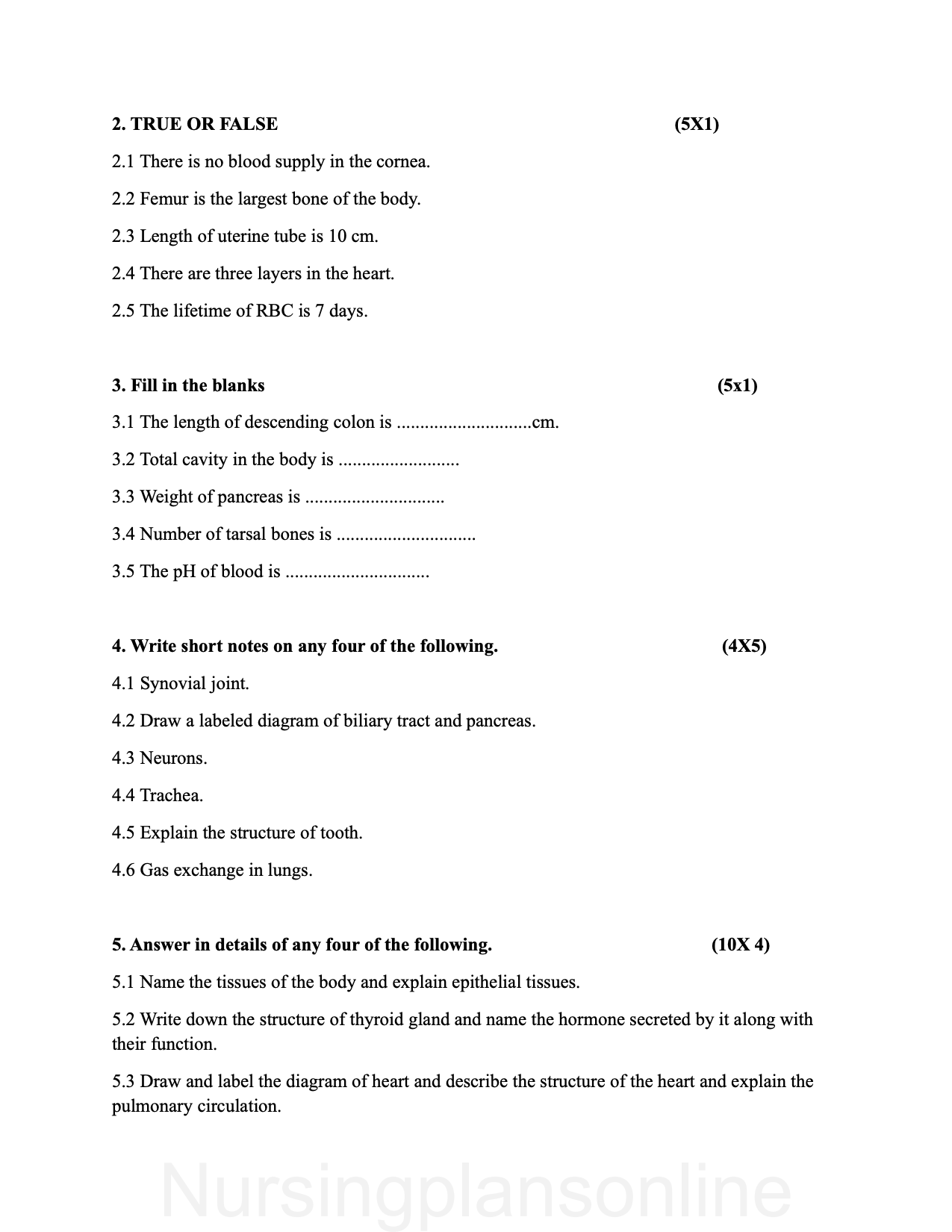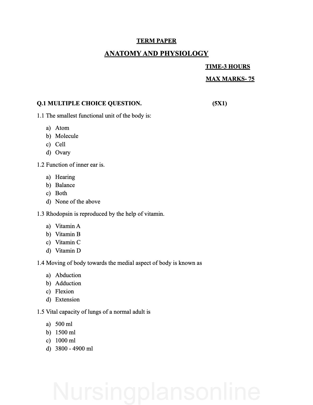 QUESTION PAPER- ANATOMY AND PHYSIOLOGY